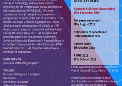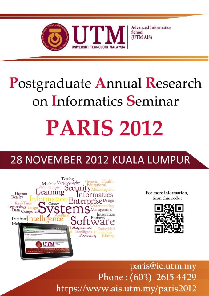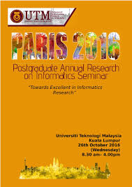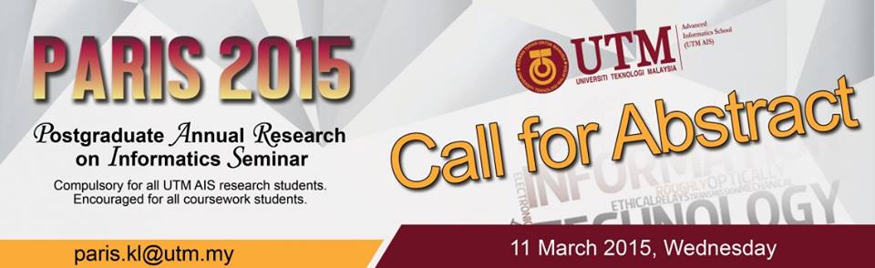 Following the success of the previous conferences since 2012, the Advanced Informatics Department, Razak Faculty of Technology and Informatics (formerly known as Advanced Informatics School), Universiti Teknologi Malaysia (UTM) is pleased to announce the Postgraduate Annual Research on Informatics Seminar (PARIS 2019). Hence, PARIS2019 welcomes participants/authors from all organizations, & professional societies from various countries around the world to join/contribute complete, original and unpublished research papers related to the significant advances in computing and informatics.